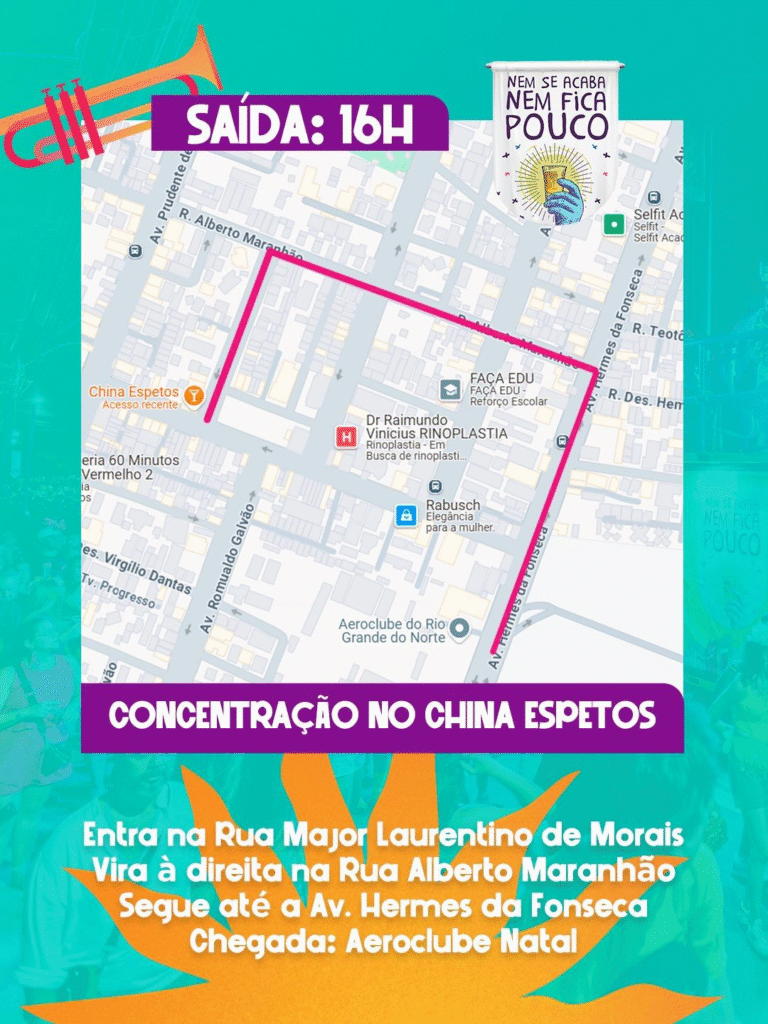 A concentração acontece a partir das 16h, no China Espetos, ponto tradicional de largada do bloco. A saída do trio está prevista para o mesmo horário, com destino ao Aeroclube de Natal, onde a programação segue com estrutura completa de palco, bares e segurança.