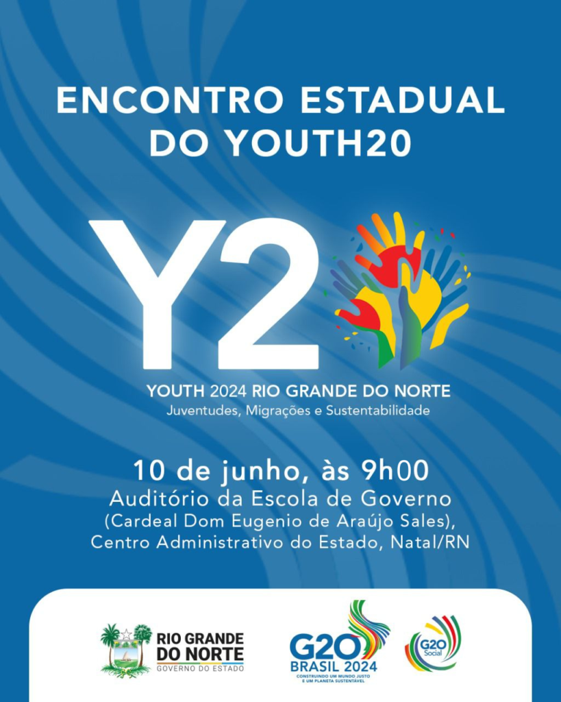 No próximo dia 10 de junho, acontece o encontro estadual do Youth20 (Y20) – Grupo Oficial de Engajamento de Juventude do Grupo dos Vinte (G20). O evento acontece no auditório da Escola de Governo, a partir das 8h, proporcionando um ambiente para interação, diálogo e colaboração em relação aos desafios globais mais urgentes. O evento é realizado em parceria com o Fórum Nacional de Gestores Estaduais de Políticas Públicas de Juventude – FONAJUVE, Agência da ONU para Migrações (OIM), Comitê Estadual Intersetorial de Atenção aos Refugiados, Apátridas e Migrantes(CERAM) e Conselho Estadual de Juventude (CEJUV). Clique aqui para fazer a inscrição.