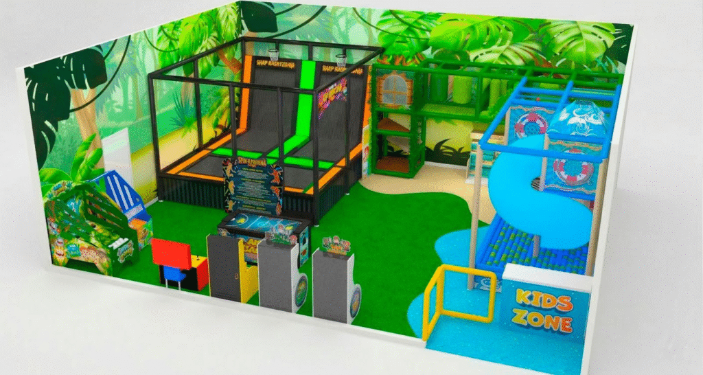 Com cerca de 110 m², a unidade reúne atrações como trampolim, circuito de atividades, mini mundo temático, jogos eletrônicos e um espaço para pintura, oferecendo diferentes possibilidades de diversão em um só lugar. O projeto foi pensado para proporcionar experiências dinâmicas, que vão além do brincar tradicional, valorizando o entretenimento como parte do convívio familiar.
